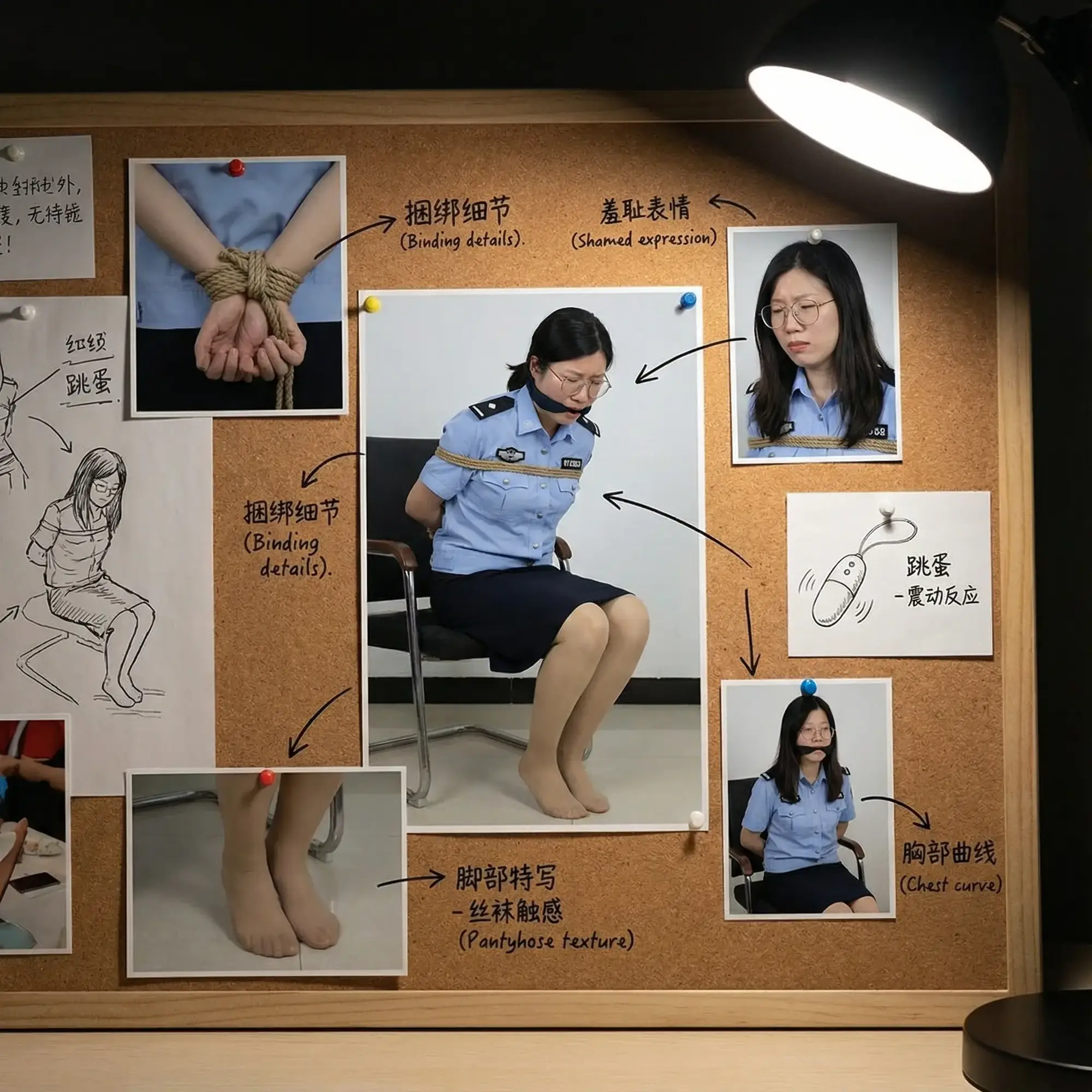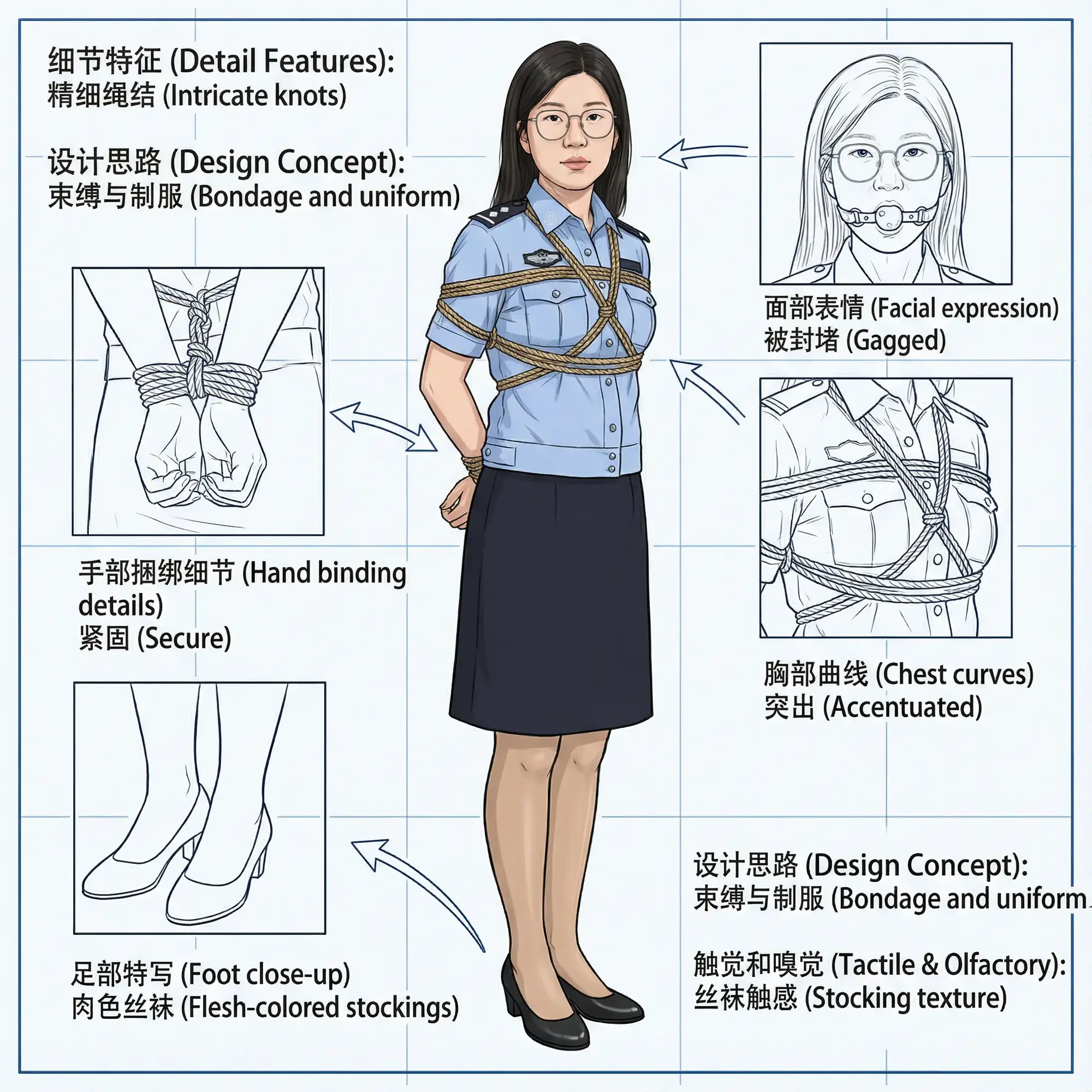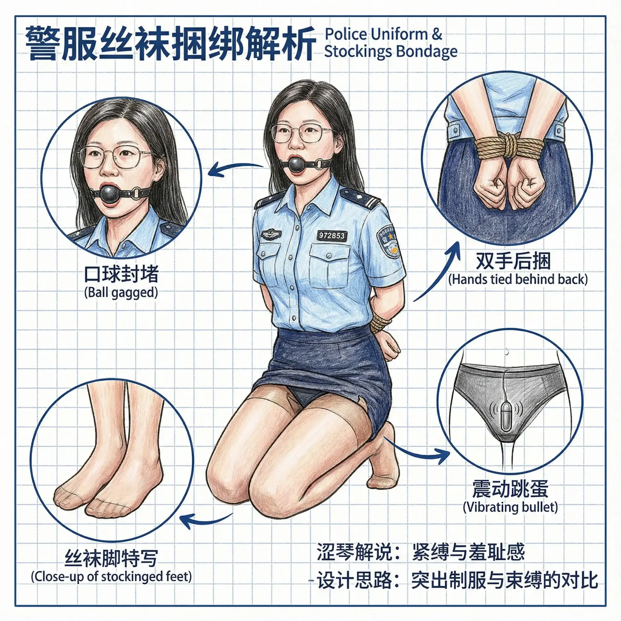 在紧身衣料下微微起伏,乳晕的粉嫩边缘隐约透过白色衬衫透出。她下身是标准警裙,长度刚过膝盖,露出肉色连裤丝袜包裹的修长双腿,从裙摆下延伸到黑色警靴。丝袜薄透如第二层皮肤,泛着细腻的珠光,紧贴着她饱满的大腿和小腿曲线,勾勒出熟女特有的丰盈与弹性。内裤是简约的白色棉质,包裹着她翘臀和