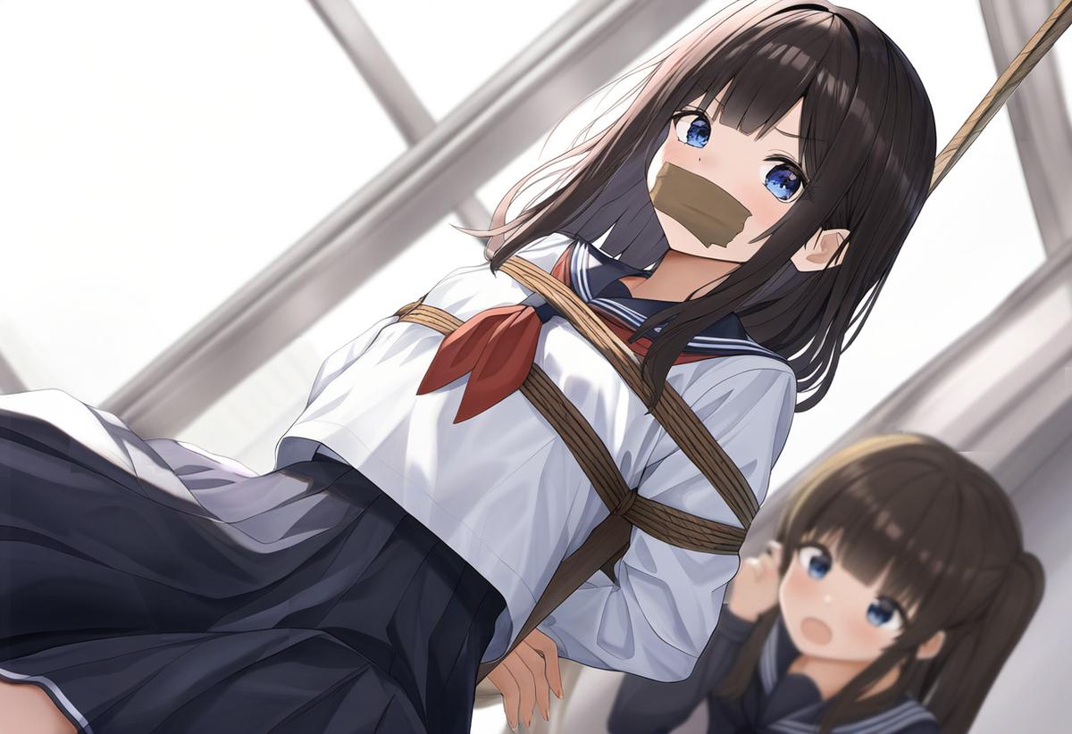 她被绑在椅子上。她正穿着带蓝色水手领的白色水手服上衣,深蓝色的百褶裙。